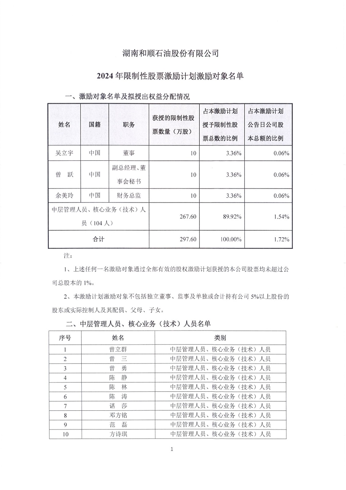湖南和順石油股份有限公司(以下簡稱“公司”)于2024年4月25日召開第三屆董事會第九次會議和第三屆監(jiān)事會第八次會議,審議并通過《關(guān)于公司<2024年限制性股票激勵計(jì)劃(草案)>及摘要的議案》等相關(guān)議案。根據(jù)中國證券監(jiān)督管理委員會《上市公司股權(quán)激勵管理辦法》的有關(guān)規(guī)定,公司對2024年限制性股票激勵計(jì)劃激勵對象的姓名和職務(wù)進(jìn)行如下公示,公示期為2024年4月30日至2024年5月9日,共10天。在公示期間,對公示對象有異議的,可經(jīng)書面郵件形式向公司監(jiān)事會反映,接收郵箱為:pengmujun@hnhsjt.com。