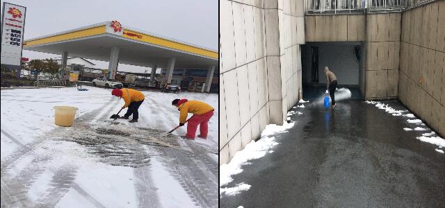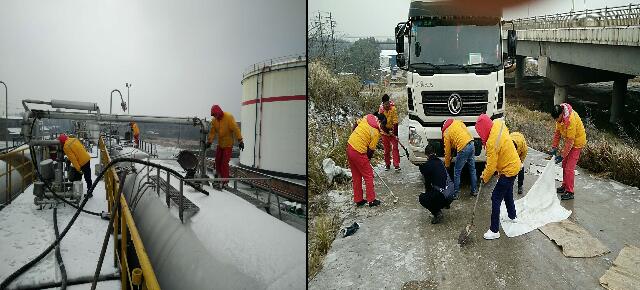 寒風(fēng)中,油庫一線員工為維護(hù)正常卸、發(fā)油而冒雪工作,檢查設(shè)施設(shè)備狀態(tài);物流車隊司機(jī)們風(fēng)雪無阻,排除困難,按時按點將油品安全送達(dá)客戶、送到各站點;各個加油站基層員工通力合作,掃除油站積雪,保障油站進(jìn)出通道順暢通行和行車安全;總部行政、物業(yè)人員也及時給辦公樓前坪進(jìn)行掃雪、除冰,為行政辦公工作保駕護(hù)航。